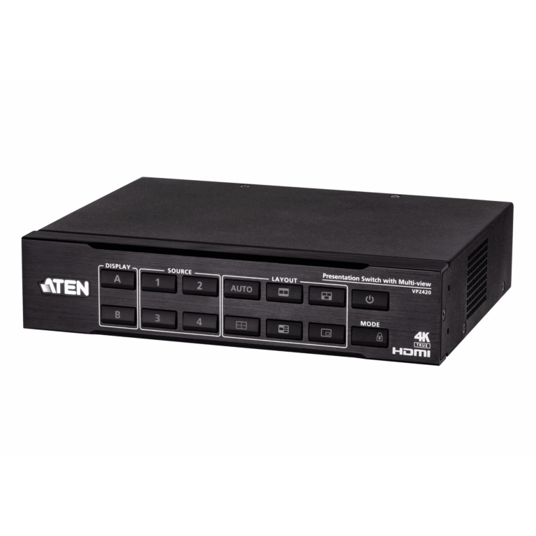 Switch HDMI de Presentación 4×2 True 4K / Multi View / 4 HDMI Entradas / 2 HDMI Salidas / Escalador 4K Integrado / Control RS-232, IR, Telnet, Web GUI / Montaje en Rack / Modo de Espera para Ahorro de Energía