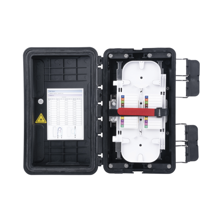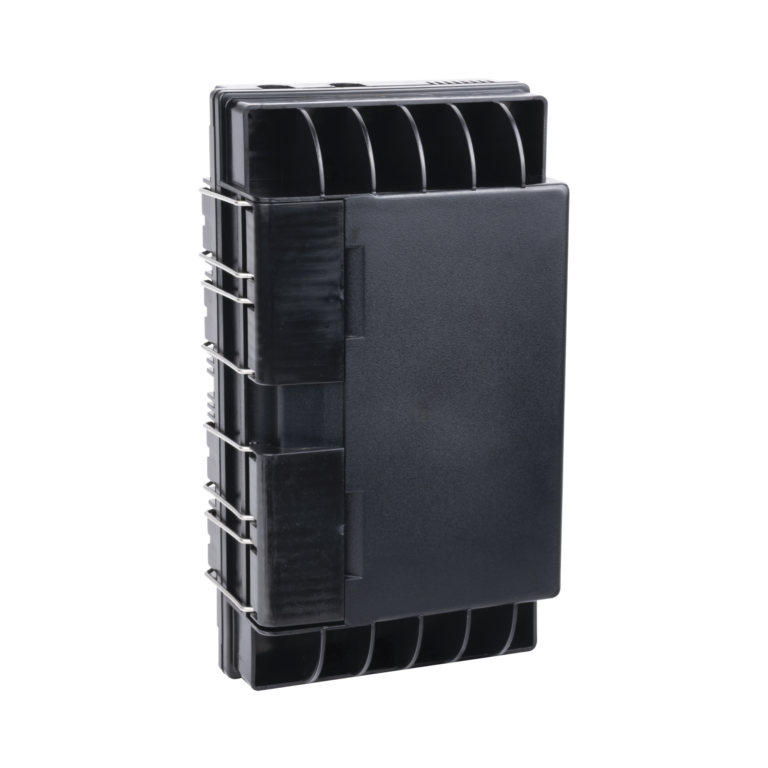 Caja de Distribución de Fibra Óptica, Hasta 96 Empalmes, Exterior IP65, Color Negro