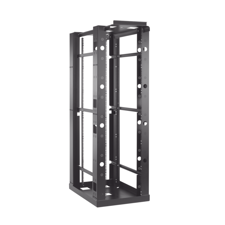 Rack de Cuatro Postes Estándar de 19″, Rieles Numerados y Roscados #12-24, Profundidad Ajustable de 450 a 1050 mm, 45 Unidades de Rack, Color Negro