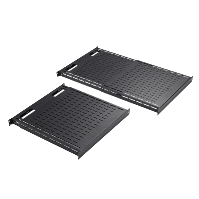 Charola Ventilada de Instalación sin Herramienta, Para Rack o Gabinetes de 4 Postes, Ajustable de 900 a 1200 mm de Profundidad, De Acero, Color Negro