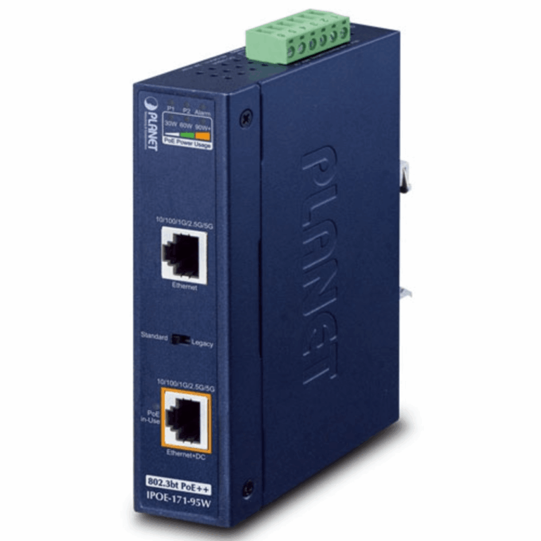 Inyector Industrial, Multi-Gigabit 802.3bt PoE++ / 95W / 2 Puertos RJ45 / 10M/100M/1G/2.5G/5Gbps / IP30 / -40 a 75°C / Montaje en Riel DIN o Pared