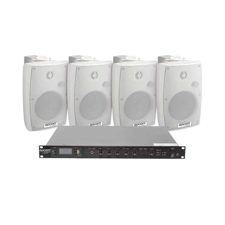 KIT de Amplificador de 120W para Escritorio | 4 Altavoces de Pared color Blanco 2.5W – 20W | Sistema 70/100V