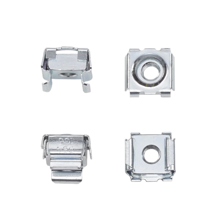 Kit de 20 Tuercas Enjauladas #10-32, Para Uso en Gabinetes o Racks con Rieles con Orificios Cuadrado, de Acero, Color Plateado