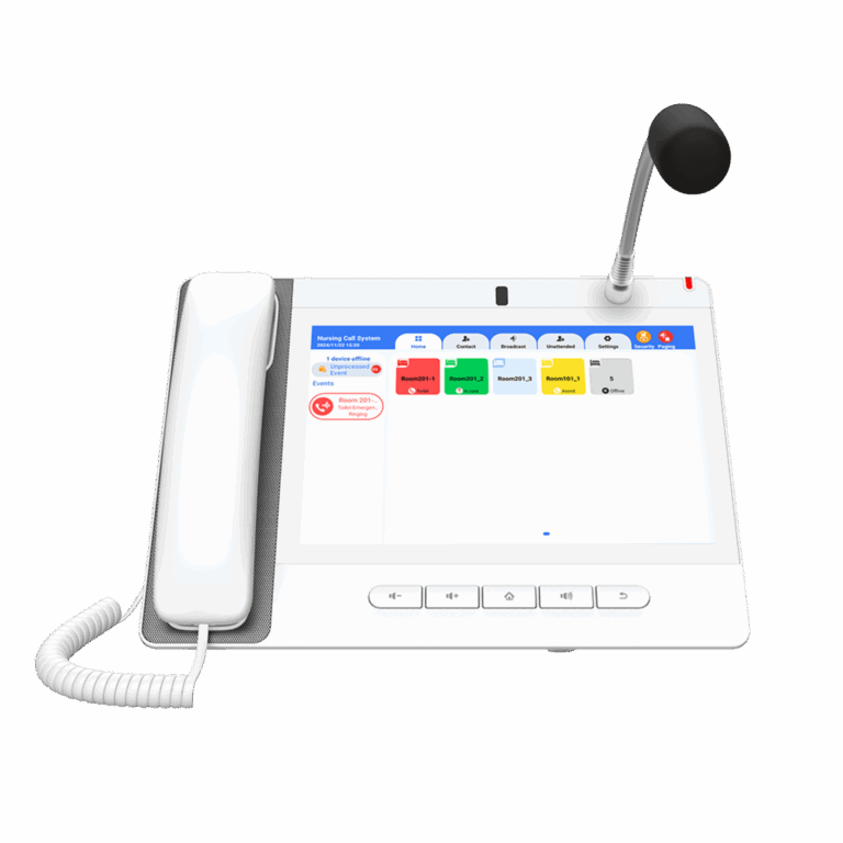Teléfono IP Color Blanco Android 9.0 Empresarial para voceo 20 líneas SIP, pantalla táctil, Wi-Fi y Bluetooth, PoE, Voceo/ Musica por Multicast, puertos Gigabit, Sofware de Enfermeria
