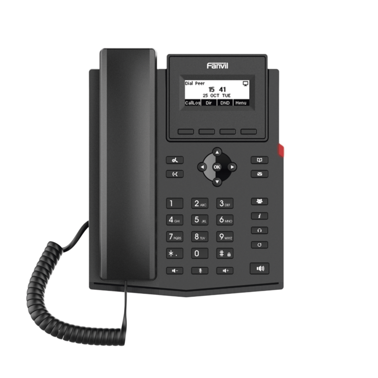Teléfono IP empresarial para 2 lineas SIP con pantalla LCD, Códec Opus, conferencia de 3 vías, PoE.