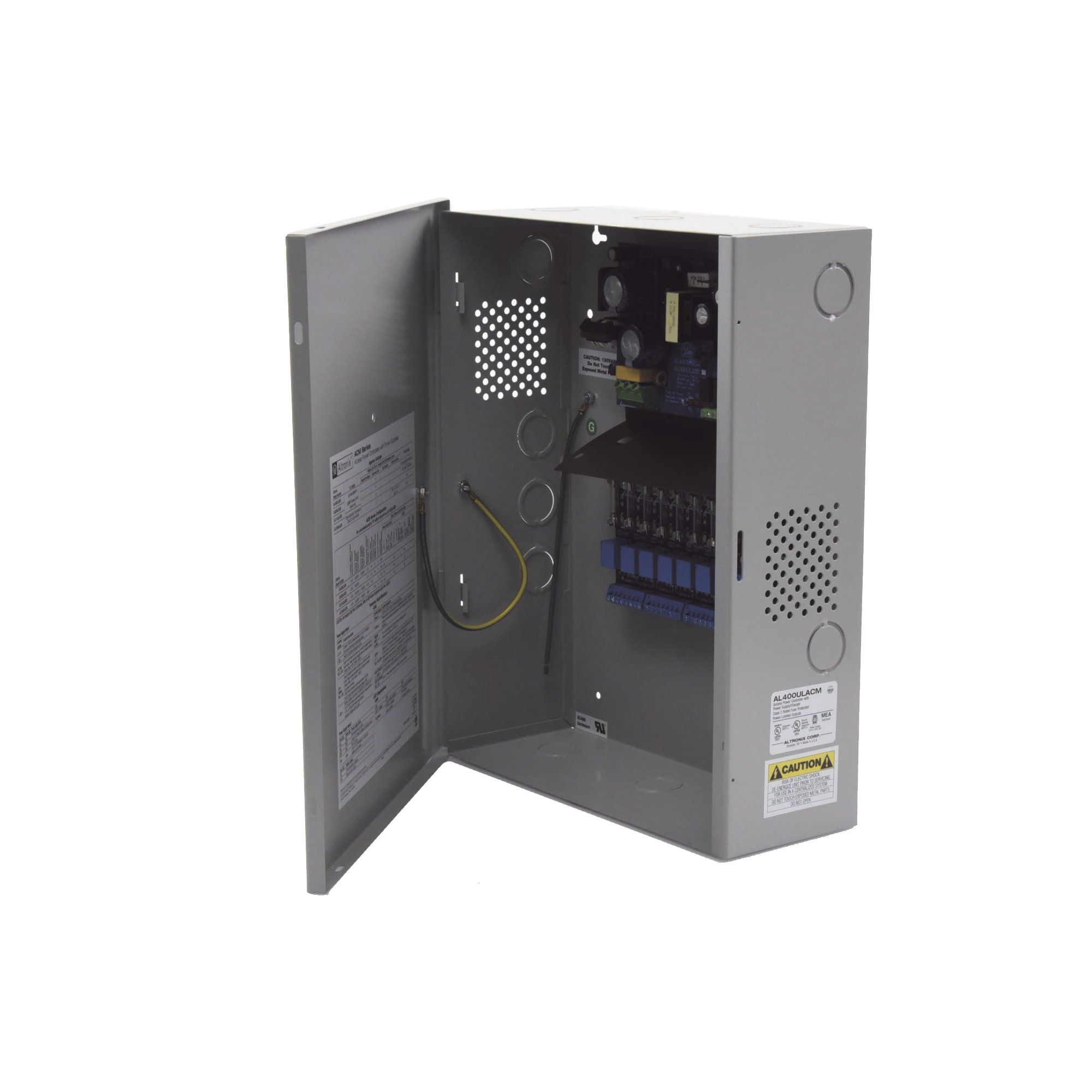 Fuente para aplicaciones en control de acceso, con capacidad de respaldo para 12 y 24 Vcc @ 4 A , con 8 circuitos de control ( NO ) y 8 circuitos de control trigger voltaje de entrada de : 115 Vca.