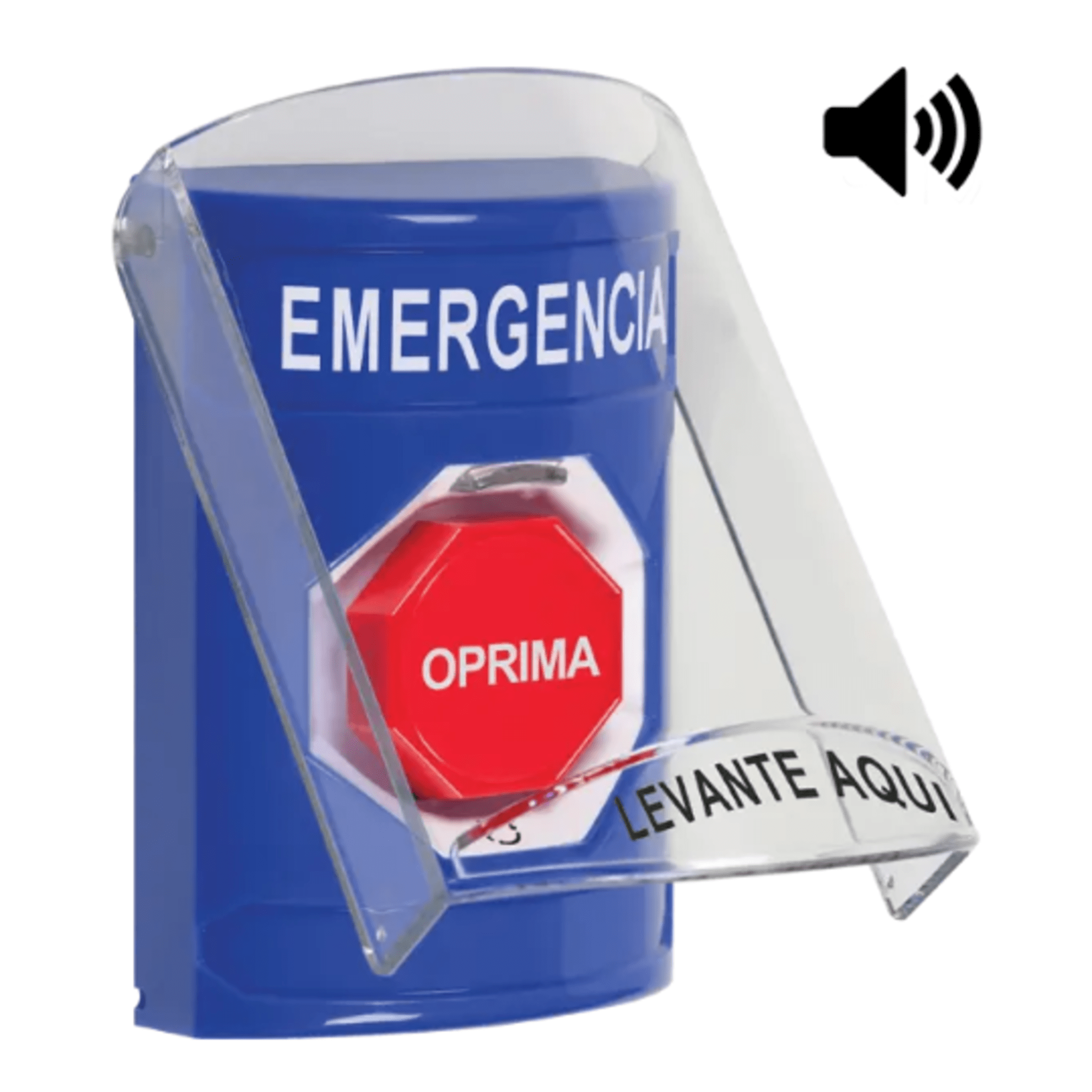Botón Multipropósito, Color Azul, De Superficie, Con Tapa De Policarbonato, Con Bocina, Para Interior, Girar Para Restablecer, Texto De Emergencia, Español