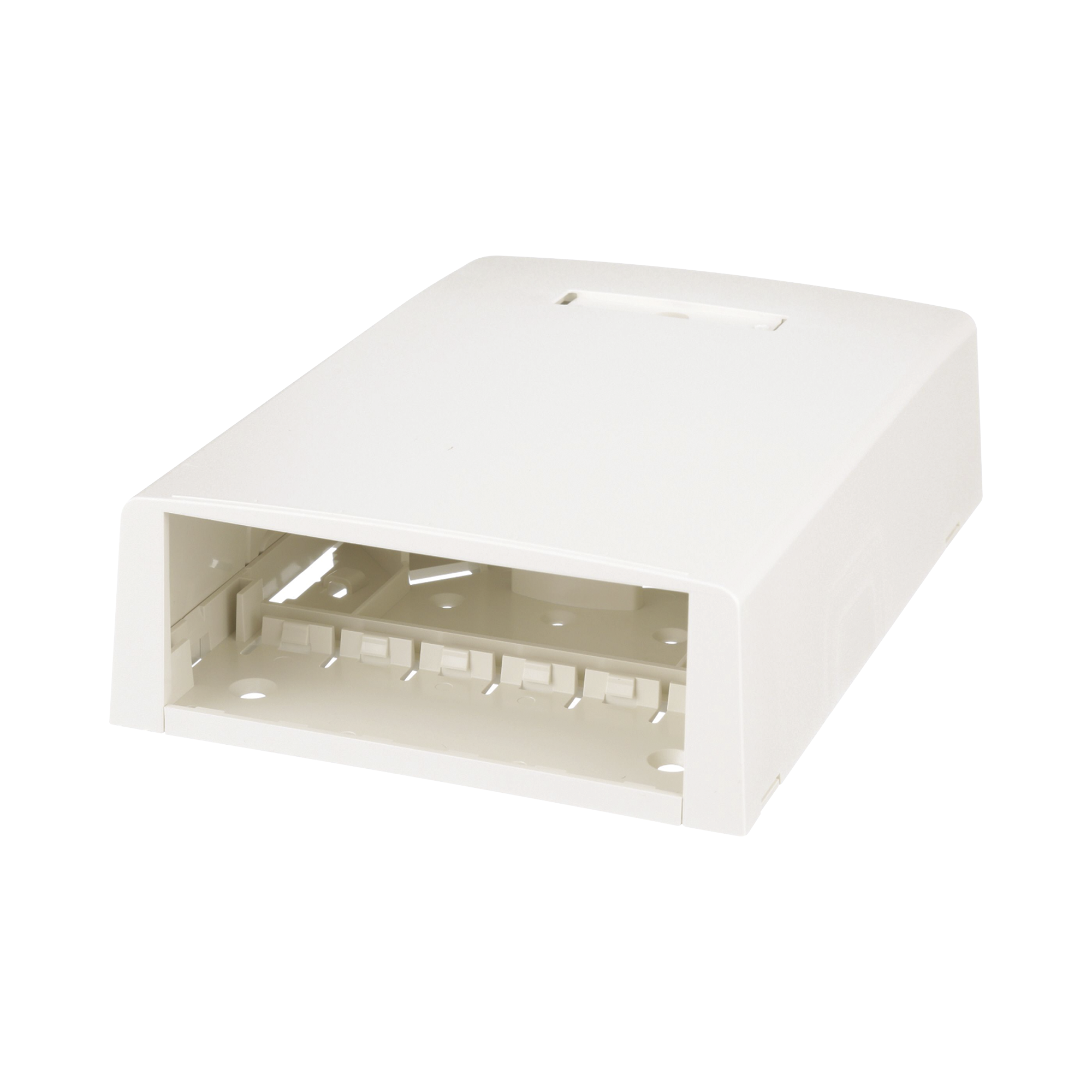 Las cajas de montaje en superficie de fibra/multimedia están disponibles en opciones de 6 y 12 puertos e incluyen un accesorio incorporado con un diseño único que asegura el cable en su lugar y puede almacenar hasta 24 metros de cable de fibra óptica con búfer. La caja incluye orificios ciegos laterales y traseros para la entrada de cables. La tapa incluirá un espacio para etiquetas con etiqueta y tapa para identificación que oculta el tornillo que fija la tapa a la base. Las cajas se instalan fácilmente con el adhesivo o los tornillos de montaje suministrados. La caja de 6 puertos incluyen ranuras para iconos sobre los puertos.