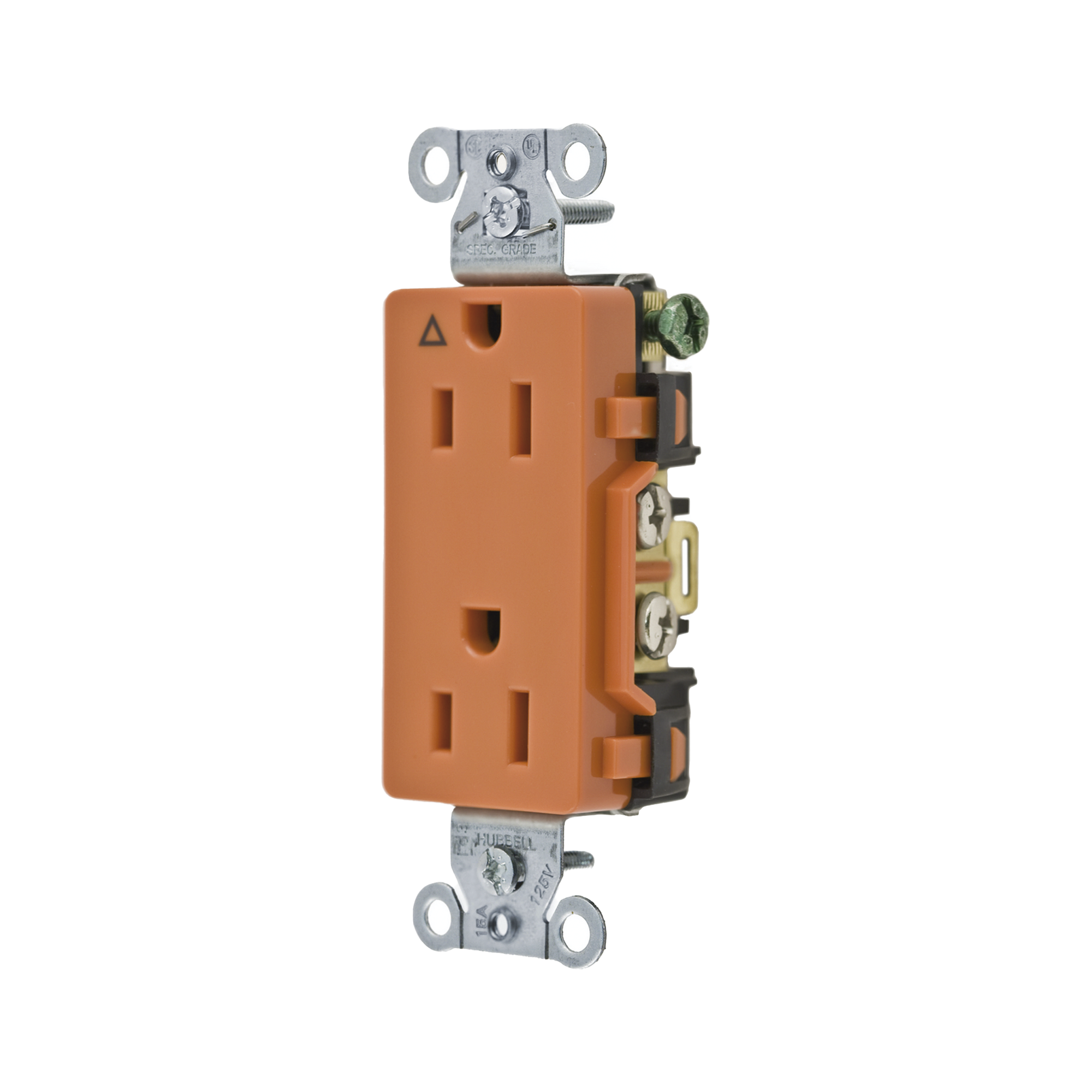 Contacto dúplex, grado comercial, 2 polos, 3 cables, 15A 125V, NEMA 5-15R, color naranja.