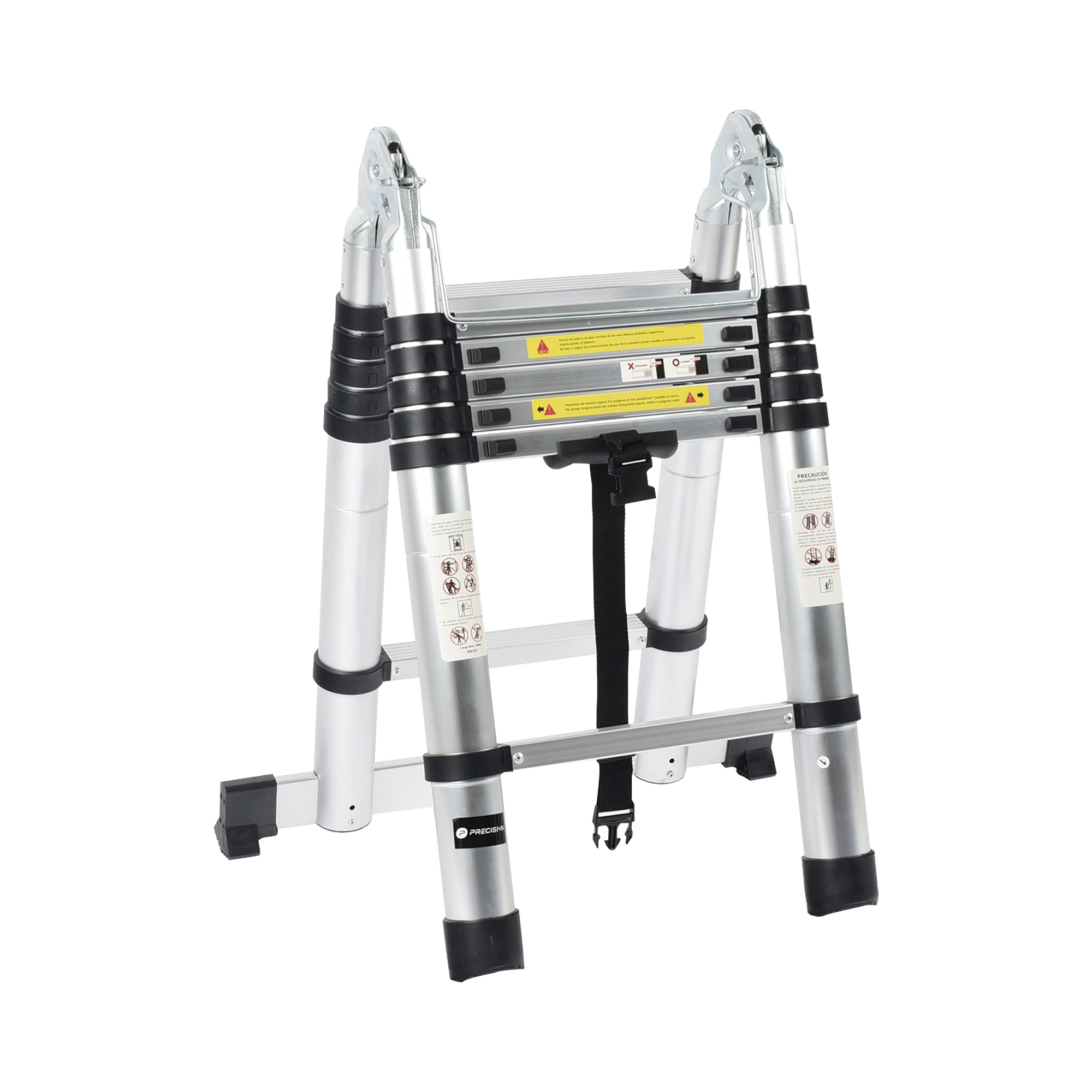 La escalera telescópica de aluminio tipo tijera PSTH10002, con una altura total de 1.9 + 1.9 metros, es la solución ideal para trabajos que requieren estabilidad y practicidad, su diseño plegable permite utilizarla en forma de tijera o desplegarla como una escalera recta, adaptándose a diversas necesidades.