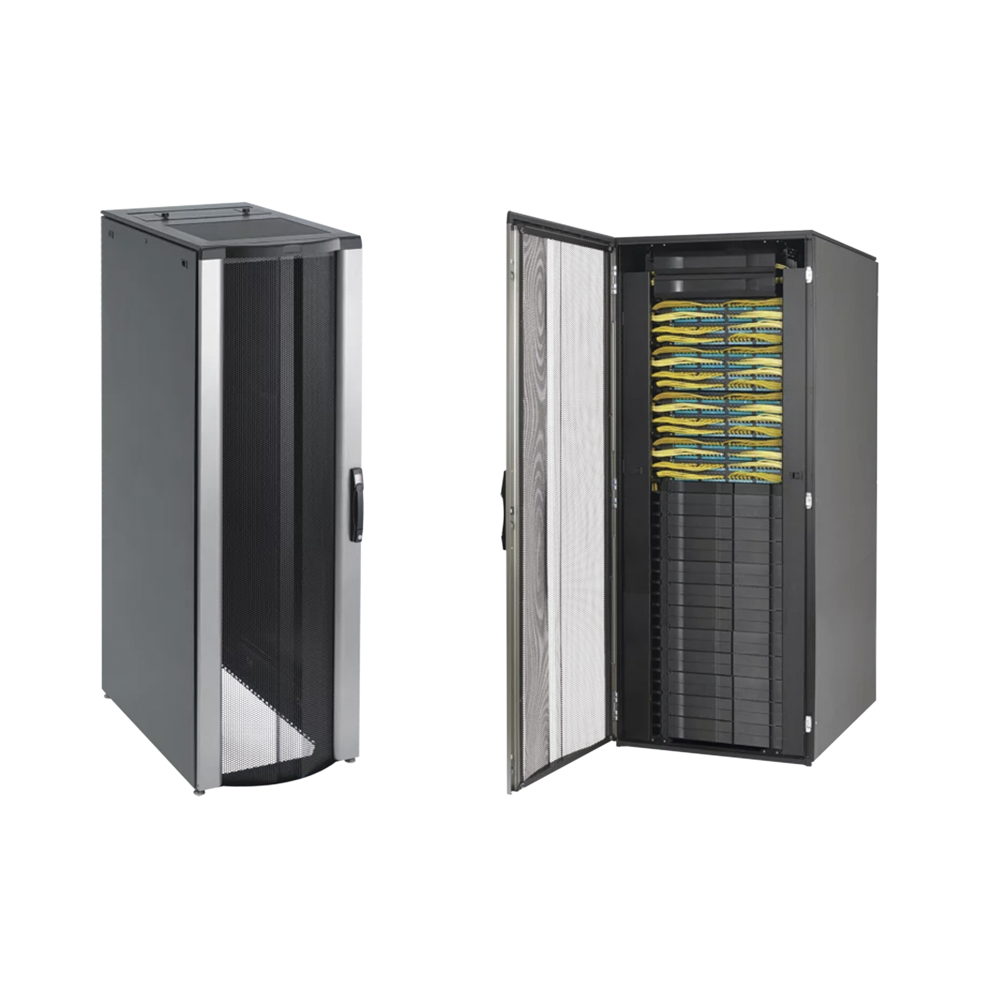 Los gabinetes de conexión/comunicación de red ProLine ConnecTek cuentan con dos organizadores de cables verticales en la parte frontal del gabinete y dos organizadores de cables traseros para un máximo enrutamiento y soporte de cables. Los gabinetes están disponibles en dos anchos para acomodar cables de alta densidad, cables de conexión y equipos de red.