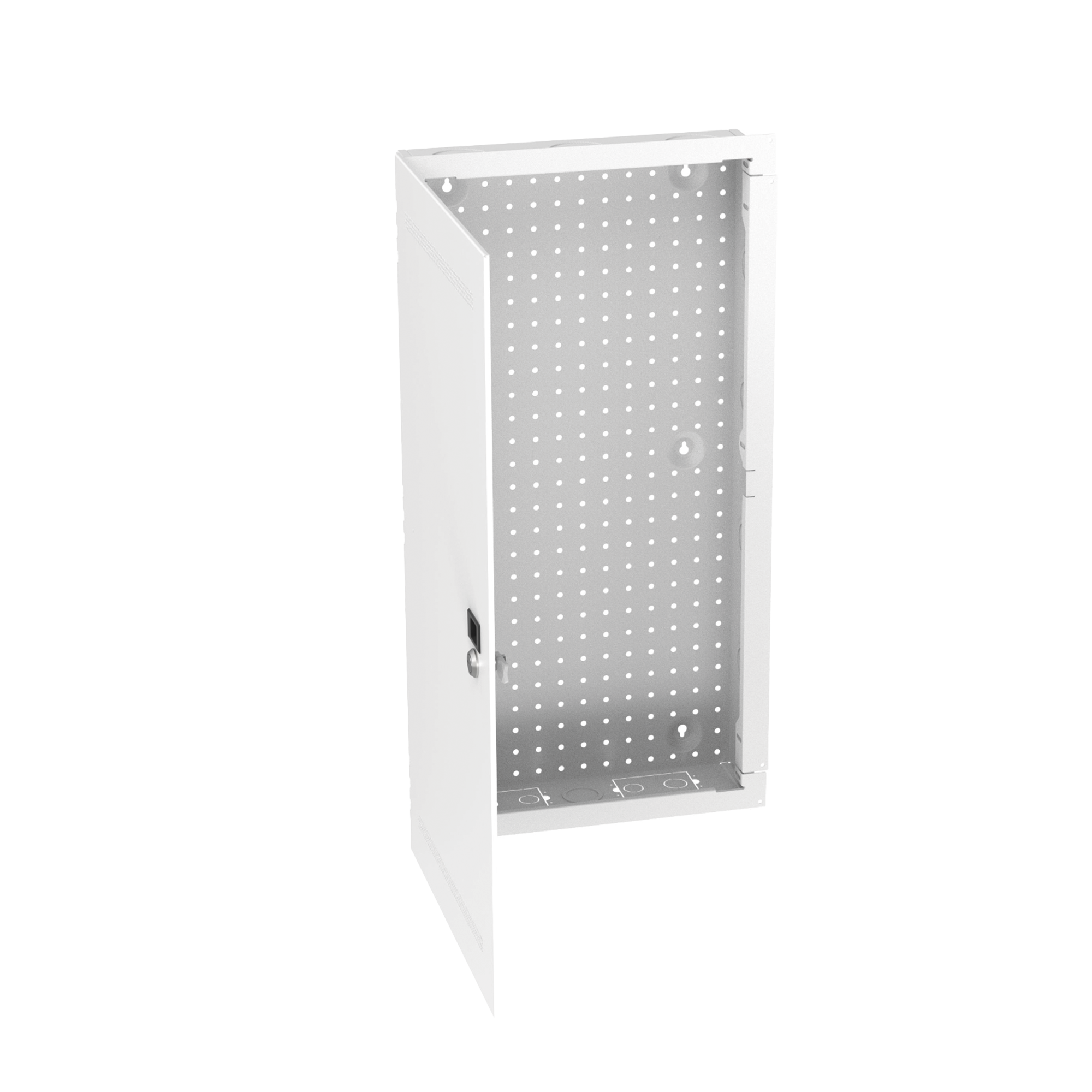 El gabinete multiusos para montaje en pared está diseñado para albergar conectividad de punto de transición y proporcionar un espacio para montar equipos de red empotrados en la pared, al mismo tiempo que brinda flexibilidad para acomodar movimientos futuros. El gabinete está construido con acero de calibre 18 y con accesorios con un diseño de empujar/tirar. Tiene una puerta con cerradura y está diseñada para permitir una ventilación adecuada para su uso con diversos equipos, entre otros, dispositivos AV u ONT, conexiones de cobre y conexiones de fibra.