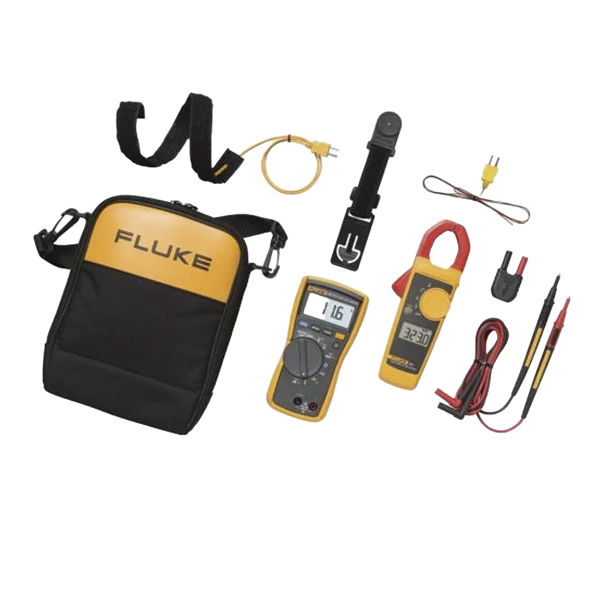 Kit combinado HVAC Fluke 116/323 HVAC, incluye: Multímetro FLUKE-166 y Pinza Amperimétrica FLUKE-323, Puntas de Prueba TL175, Soporte Magnético TPak ToolPak, Pinza termocupla flexible, Sonda de Temperatura 80BK, Adaptador para termocupla 80AK-A y Estuche de lujo con correa para hombro.