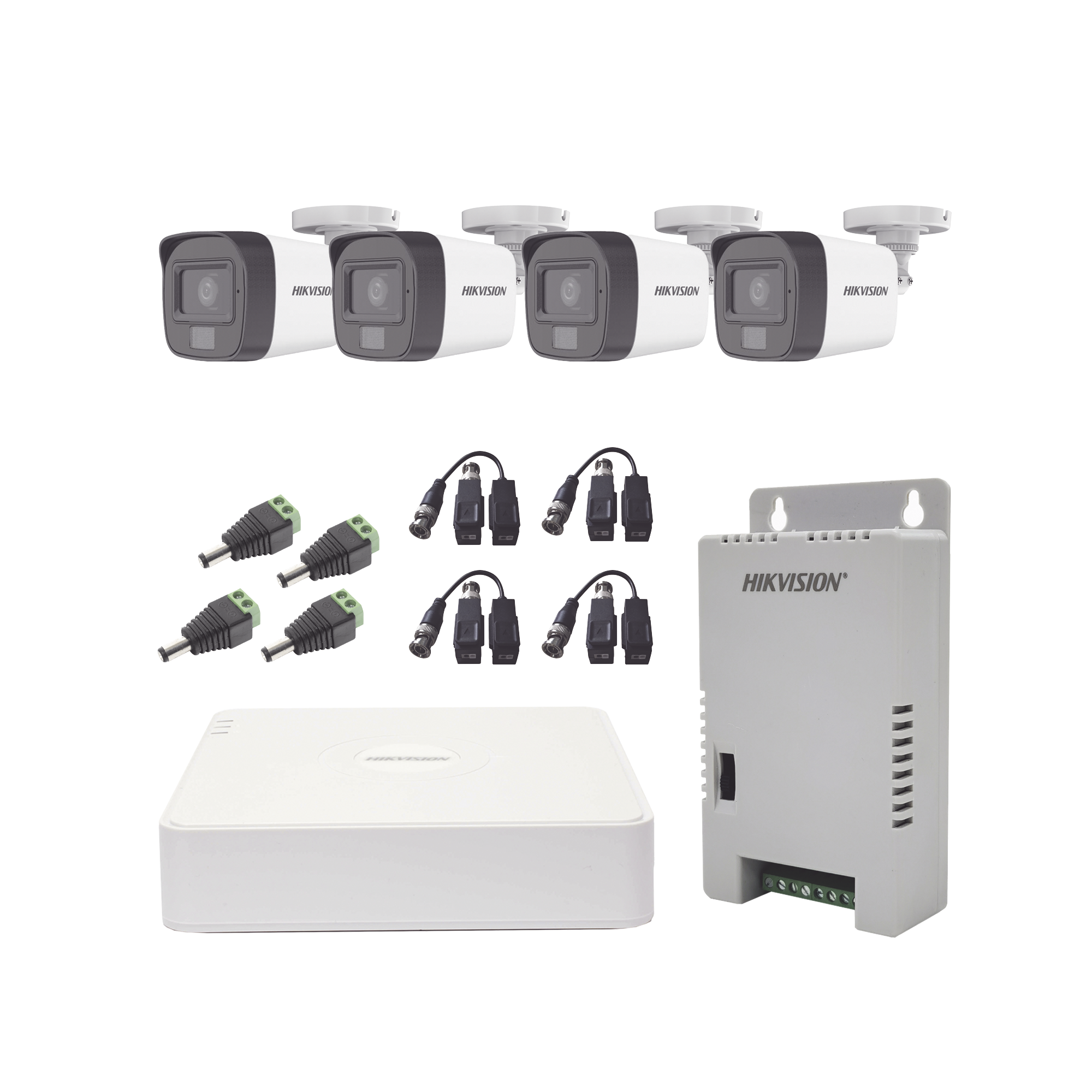 Kit TURBOHD 1080p / DVR 4 Canales / 4 Cámaras con Micrófono Integrado y 101° Visión / Luz Blanca + IR Visión Nocturna / Transceptores / Conectores / Fuente de Poder Profesional Compacta