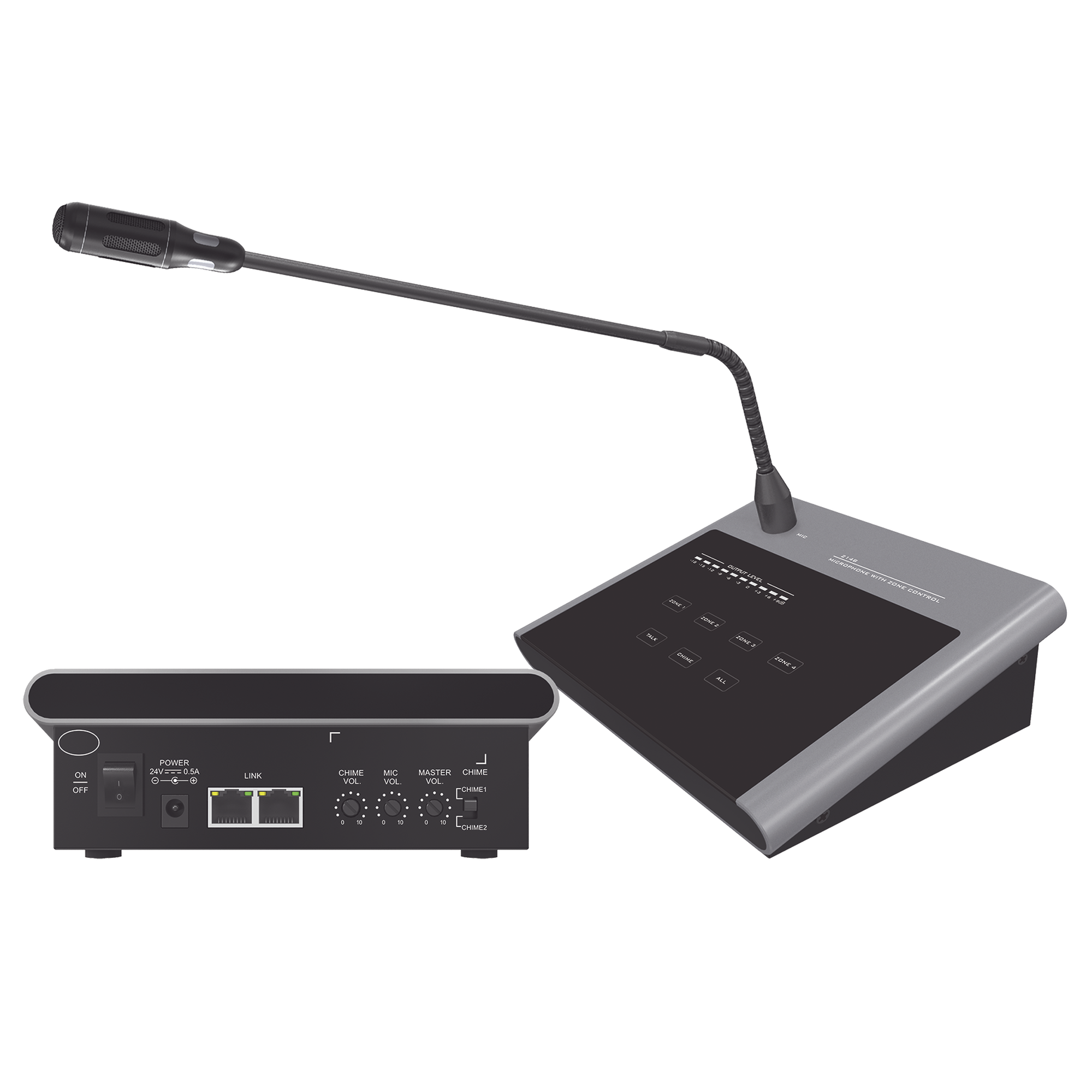 El micrófono de voceo SF-214B con capacidad de 4 zonas puede ser utilizado solo con el amplificador SF-2240UC y SF-4240UC. Están conectados por el puerto RJ45 a través de cable CAT5, se pueden conectar en cascada un máximo de 4 micrófonos hacia un amplificador, cuenta con un medidor de nivel de 10 segmentos para mostrar el nivel de salida.