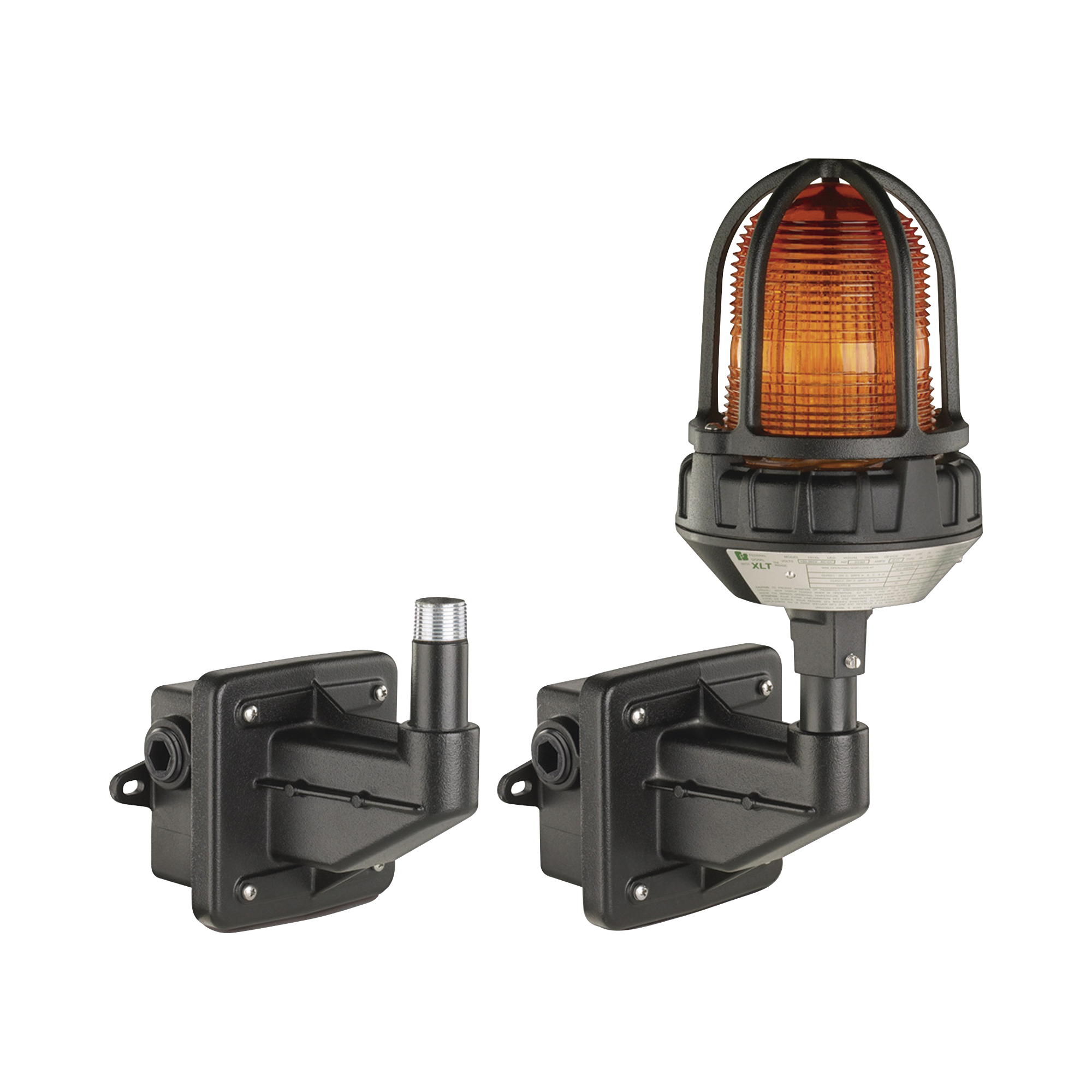 El soporte de montaje en pared para lugares peligrosos modelo LHWB está diseñado específicamente para usarse con las luces de advertencia estacionarias de Federal Signal para proporcionar un medio fácil y consistente de montar luces de forma segura en toda una instalación. El soporte cuenta con una conexión de tubería macho NPT de 3/4 de pulgada. Hay casquillos opcionales disponibles para montaje de accesorios de 1/2 pulgada y 1 pulgada.