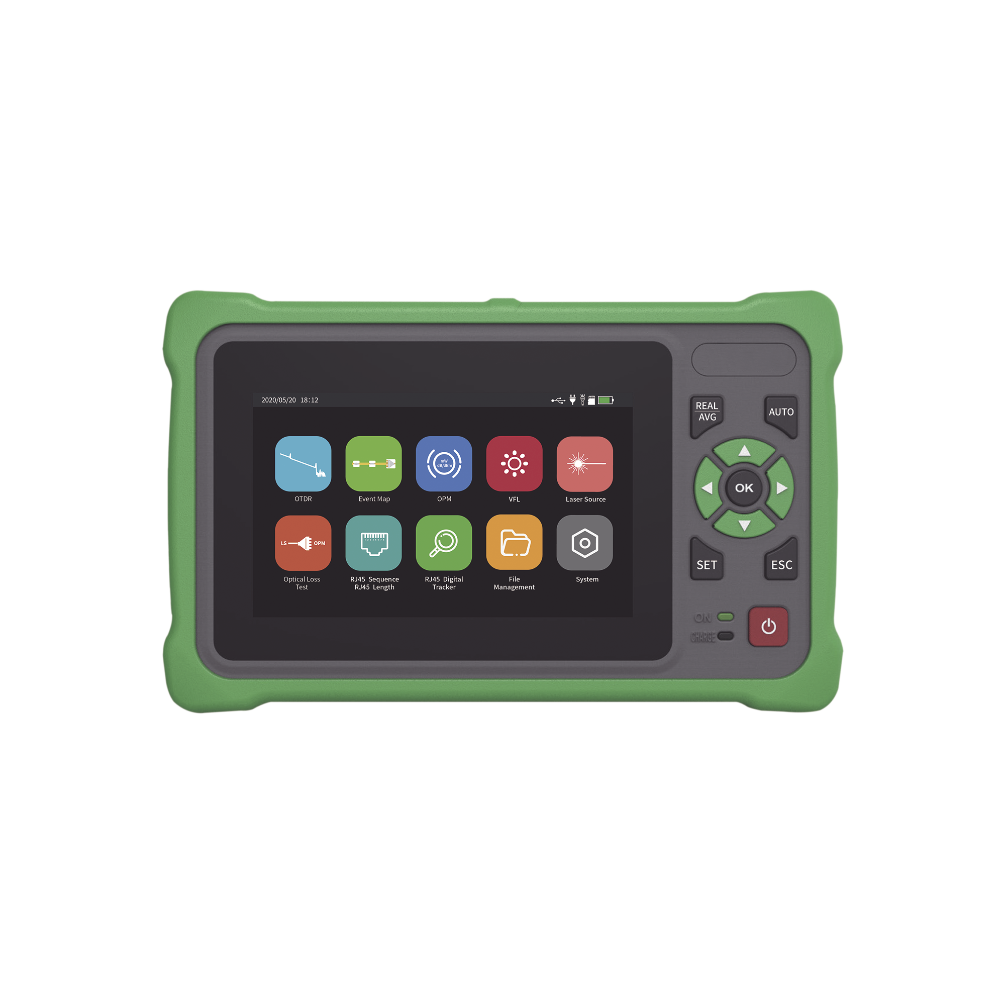 OTDR Touch para Pruebas en los Enlaces de Fibra Óptica / Longitudes de onda  1310nm y 1550nm / Función VFL 10mW / Función OPM / Función de Mapeo de cables de Red RJ45 / Recargable / Distancia de prueba de hasta 260km