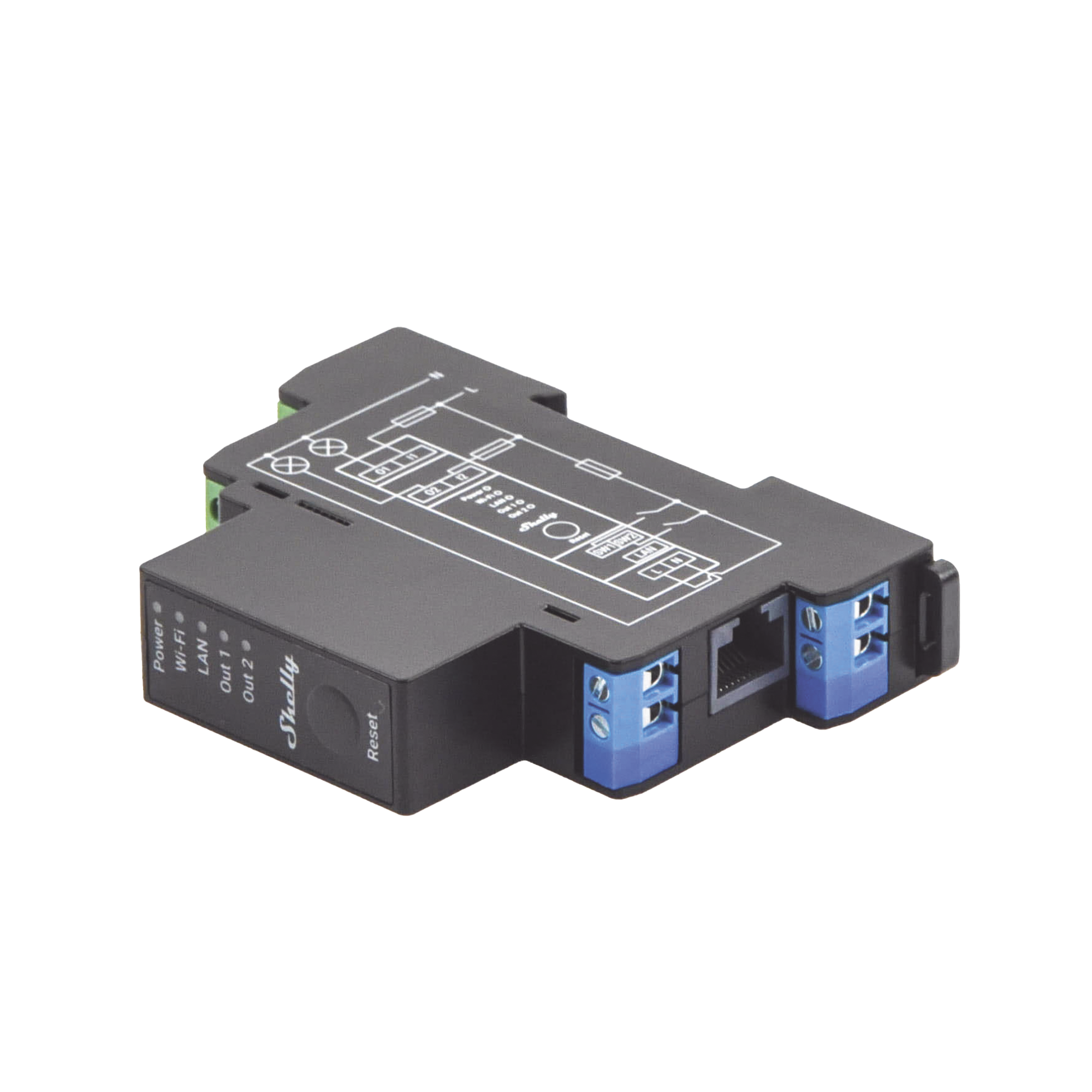 SHELLYPRO2PM de 2 canales con conexión Wi-Fi, LAN y Bluetooth, apto para domótica e instalaciones con mando a distancia. Montable en riel DIN dentro de una caja de interruptores. Funciones de seguridad mejorada y compatible con las plataformas de domótica más utilizadas como control de luces, persianas, puertas de garaje, portones, toldos, cortinas, cubiertas de piscinas, motores AC bidireccionales.