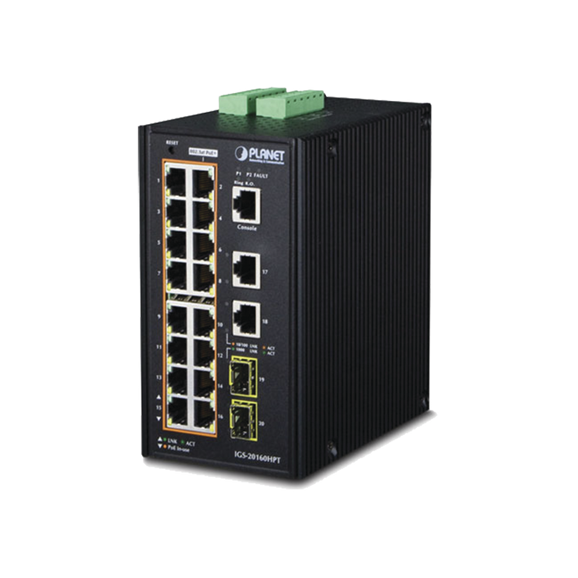 Switch Industrial Administrable 16 puertos 10/100/1000 T 802.3at PoE + 2 Puertos 10/100/1000 T + 2 puertos 100/1000 X SFP