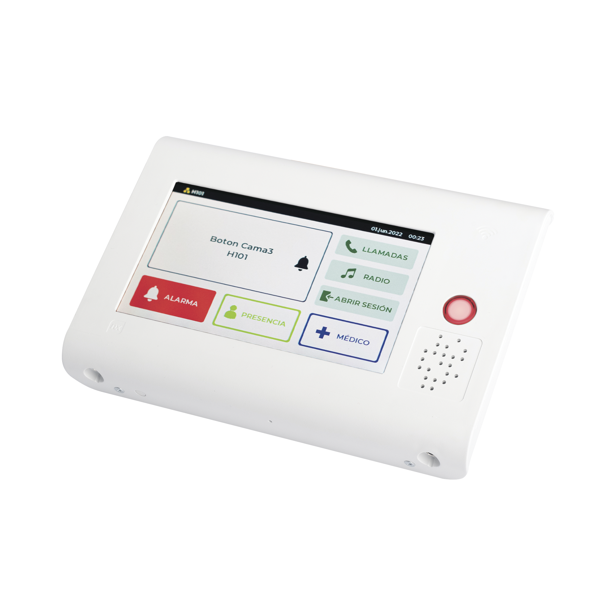 La terminal de habitación NX1021 proporciona comunicación de voz y datos a través de la conexión Ethernet PoE y actúa como controlador de los periféricos del sistema de llamada paciente-enfermera de Ibernex.